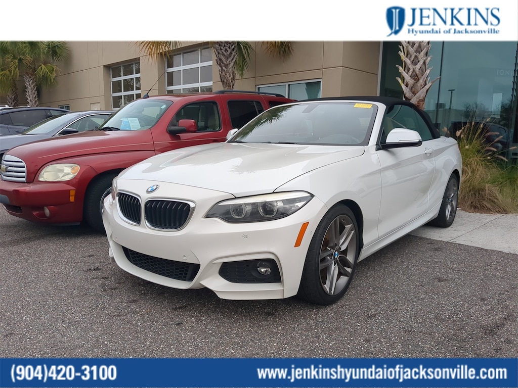 The price does not include tax, tag, license, an electronic filing fee of $449.00**, a private tag agency fee of $199.00**, and a predelivery service charge of $1199.00** **This charge represents costs and profit to the dealer for items such as inspecting, cleaning, and adjusting vehicles, as well as preparing documents related to the sale. * EPA-estimate metric: these are contingent on ideal conditions within a lab. Real-world situations such as carrying passengers or cargo, using climate control, driving style, and ambient temperatures can affect actual metrics. 24/34 City/Highway MPG Clean CARFAX. This 2018 BMW 2 Series 230i in White Metallic features 4-Wheel Disc Brakes, 6 Speakers, ABS brakes, Advanced Real-Time Traffic Information, Aerodynamic Kit, Air Conditioning, Alloy wheels, Aluminum Hexagon Trim w/High Gloss Black Highlight, AM/FM radio, Ambient Lighting, Apple CarPlay, Auto-Dimming Interior & Driver Exterior Mirrors, Auto-Dimming Rear-View Mirror, Automatic temperature control, Brake assist, Bumpers: body-color, CD player, Comfort Access Keyless Entry, Convertible roof lining, Convertible roof wind blocker, Delay-off headlights, Driver door bin, Driver vanity mirror, Dual front impact airbags, Dual front side impact airbags, Electronic Stability Control, Emergency communication system: BMW Assist eCall, Exterior Parking Camera Rear, Four wheel independent suspension, Front anti-roll bar, Front Bucket Seats, Front Center Armrest, Front dual zone A/C, Front fog lights, Front reading lights, Front Sport Seats, Fully automatic headlights, Glass rear window, Hands-Free Bluetooth & USB Audio Connection, Heated door mirrors, Heated Front Seats, Heated Steering Wheel, Hi-Fi Sound System, Illuminated entry, In-Dash CD Player, Increased Top Speed Limiter, Instrument Cluster w/Extended Contents, Integrated roll-over protection, Knee airbag, Leather Shift Knob, Low tire pressure warning, Lumbar Support, M Sport Suspension, M Steering Wheel, Navigation System, Occupant sensing airbag, Outside temperature display, Panic alarm, Park Distance Control, Parking Assistant, Passenger door bin, Passenger vanity mirror, Power convertible roof, Power door mirrors, Power driver seat, Power Front Seats, Power passenger seat, Power steering, Power windows, Radio data system, Radio: AM/FM Audio System, Rain sensing wipers, Rear anti-roll bar, Rear window defroster, Remote keyless entry, Remote Services, Security system, SensaTec Upholstery, Shadowline Exterior Trim, SiriusXM Satellite Radio, Speed control, Speed-sensing steering, Speed-Sensitive Wipers, Sport steering wheel, Steering wheel mounted audio controls, Tachometer, Telescoping steering wheel, Tilt steering wheel, Traction control, Trip computer, Turn signal indicator mirrors, Universal Garage-Door Opener, Variable Sport Steering, Variably intermittent wipers, Wheels: 17" x 7.5" Bi-Color (Style 725), and Wheels: 18" x 7.5" Fr & 18" x 8.0" Rr (Style 461M) . Visit our showroom 24/7 at Jenkinshyundaiofjacksonville or call 904-420-3100. RWD