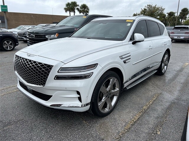 This vehicle comes equipped with Prestige Package (3-Zone Climate Control, Blind-Spot View Monitor, Ergo Motion Driver Seat, Head-Up Display, Heated 2nd Row Seats, Option Group 06, Power Cushion Extension & Bolster, Radio: AM/FM/SiriusXM/HD Lexicon Prem Audio System, Remote Smart Parking Assist, Reverse Parking Collision-Avoidance Assist, and Surround View Monitor), 12 Speakers, 12.3" 3D Digital Instrument Cluster, 2nd Row Vanity Mirrors, 3.909 Axle Ratio, 4-Wheel Disc Brakes, ABS brakes, Active Noise Control, Adaptive suspension, Air Conditioning, Alloy wheels, AM/FM radio: SiriusXM, Android Auto & Apple CarPlay, Anti-whiplash front head restraints, Auto High-beam Headlights, Auto tilt-away steering wheel, Auto-dimming door mirrors, Auto-dimming Rear-View mirror, Automatic temperature control, Brake assist, Bumpers: body-color, Compass, Delay-off headlights, Driver door bin, Driver vanity mirror, Dual front impact airbags, Dual front side impact airbags, Electronic Limited Slip Differential, Electronic Stability Control, Emergency communication system: Genesis Connected Services, Exterior Parking Camera Rear, Forward Attention Warning, Four wheel independent suspension, Front anti-roll bar, Front Bucket Seats, Front Center Armrest, Front dual zone A/C, Front reading lights, Fully automatic headlights, Garage door transmitter: HomeLink, Genuine wood console insert, Genuine wood dashboard insert, Genuine wood door panel insert, Heated & Ventilated Front Bucket Seats, Heated door mirrors, Heated front seats, Heated steering wheel, Illuminated entry, Knee airbag, Leather Seating Surfaces, Leather steering wheel, Leatherette Seating Surfaces, Low tire pressure warning, Memory seat, Nappa Leather Seating Surfaces, Navigation System, Occupant sensing airbag, Outside temperature display, Overhead airbag, Overhead console, Panic alarm, Passenger door bin, Passenger vanity mirror, Power 2nd Row Outboard Seats, Power Door Closure, Power door mirrors, Power driver seat, Power Folding 3rd Row Seat, Power Liftgate, Power moonroof, Power passenger seat, Power Rear Door Shades, Power steering, Power windows, Radio data system, Radio:14.5" Navigation System w/AM/FM/HD Radio, Rain sensing wipers, Rear air conditioning, Rear anti-roll bar, Rear reading lights, Rear seat center armrest, Rear side impact airbag, Rear window defroster, Rear window wiper, Remote keyless entry, Security system, Speed control, Speed-sensing steering, Speed-Sensitive Wipers, Split folding rear seat, Spoiler, Steering wheel memory, Steering wheel mounted audio controls, Suede Headliner, Tachometer, Telescoping steering wheel, Tilt steering wheel, Traction control, Trip computer, Turn signal indicator mirrors, Variably intermittent wipers, Ventilated 2nd Row Outboard Seats, Ventilated front seats, Wheels: 20" x 8.5J Medium Metallic Gray Alloy, and Wheels: 22" x 9.5J Alloy .