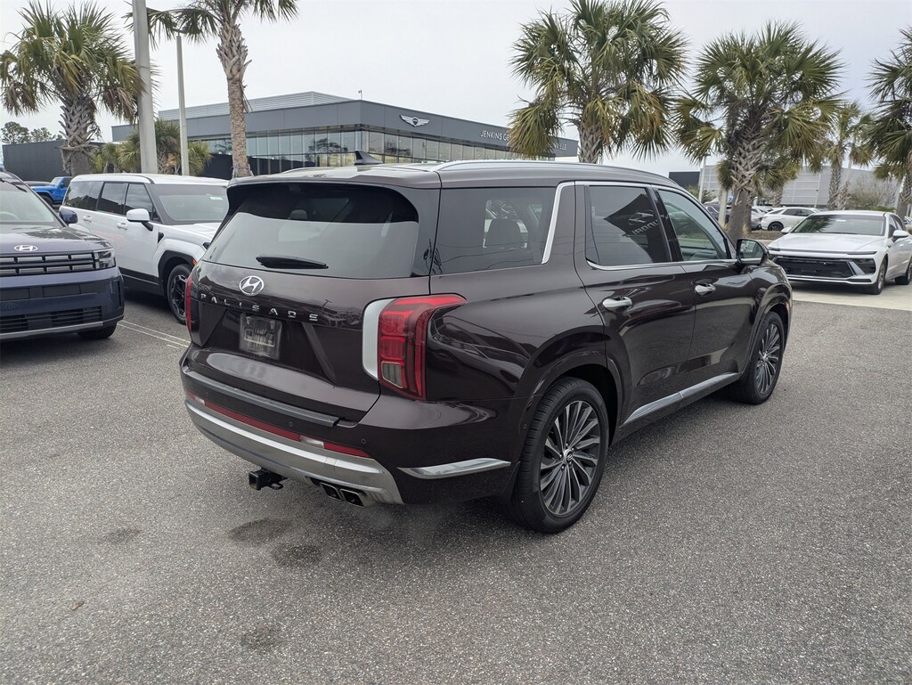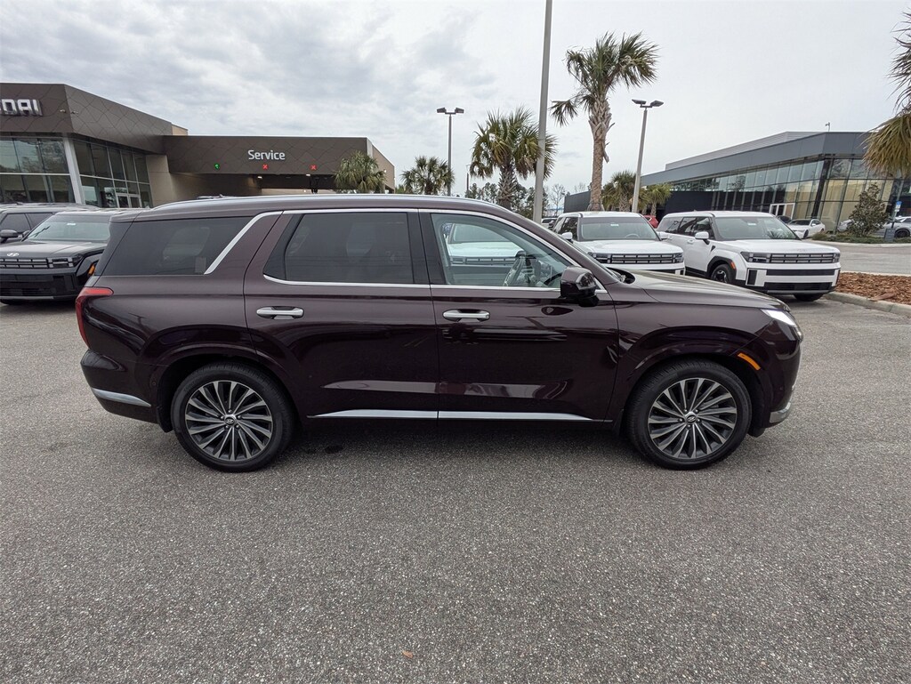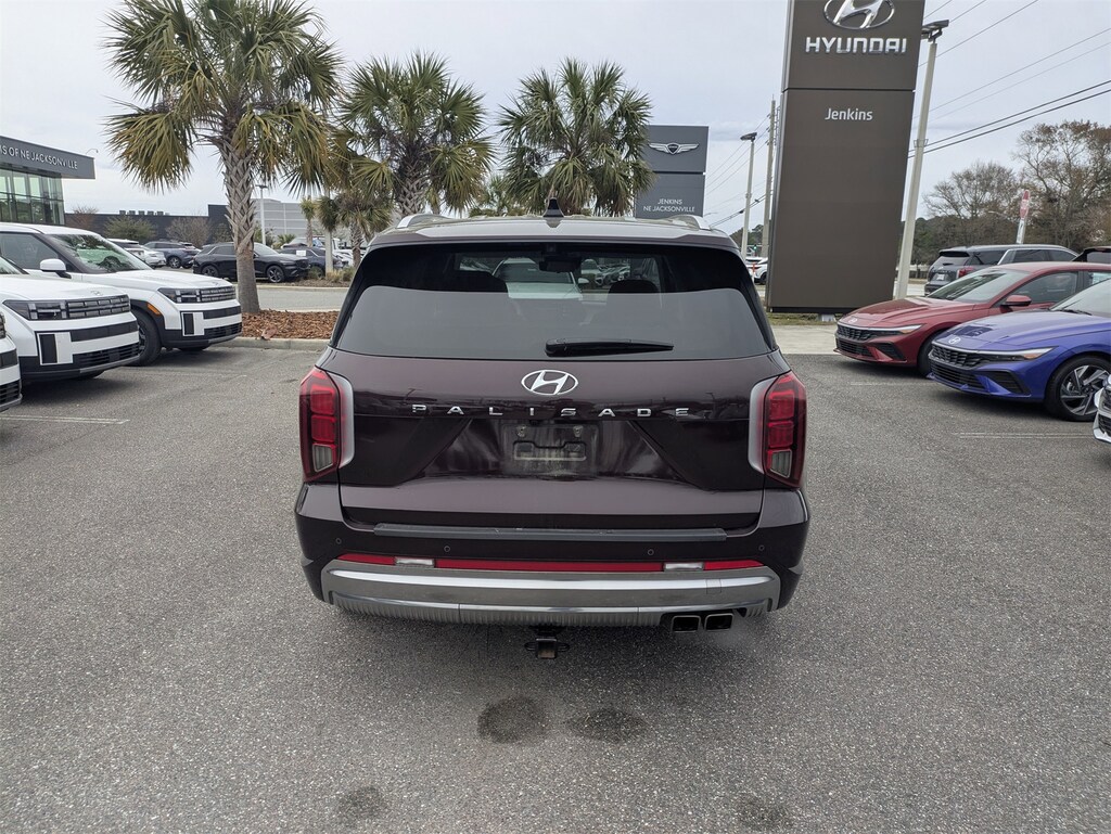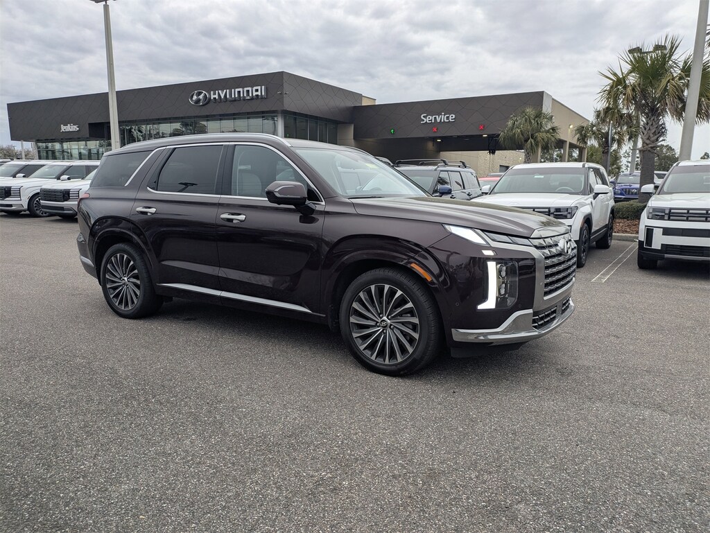 The price does not include tax, tag, license, an electronic filing fee of $449.00**, a private tag agency fee of $199.00**, and a predelivery service charge of $1199.00** **This charge represents costs and profit to the dealer for items such as inspecting, cleaning, and adjusting vehicles, as well as preparing documents related to the sale. * EPA-estimate metric: these are contingent on ideal conditions within a lab. Real-world situations such as carrying passengers or cargo, using climate control, driving style, and ambient temperatures can affect actual metrics. 19/27 City/Highway MPG CARFAX One-Owner. This 2023 Hyundai Palisade Calligraphy in Sierra Burgundy features Option Group 01, Winter Package (All-Season Fitted Liners and Splash Trim), 12 Speakers, 3.510 Axle Ratio, 3rd row seats: split-bench, 4-Wheel Disc Brakes, ABS brakes, Air Conditioning, Alloy wheels, AM/FM radio: SiriusXM, Apple CarPlay & Android Auto, Auto High-beam Headlights, Auto-dimming door mirrors, Auto-dimming Rear-View mirror, Auto-leveling suspension, Automatic temperature control, Brake assist, Bumpers: body-color, Cargo Net, Cargo Tray, Carpeted Floor Mats, Compass, Delay-off headlights, Driver door bin, Driver vanity mirror, Dual front impact airbags, Dual front side impact airbags, Electronic Stability Control, Emergency communication system: Blue Link Connected Car Service (3-year complimentary subscription), Exterior Parking Camera Rear, First Aid Kit, Four wheel independent suspension, Front anti-roll bar, Front Bucket Seats, Front Center Armrest, Front dual zone A/C, Front reading lights, Fully automatic headlights, Garage door transmitter: HomeLink, harman/kardon® Speakers, Heads-Up Display, Heated & Ventilated Front Bucket Seats, Heated door mirrors, Heated front seats, Heated rear seats, Heated steering wheel, Illuminated entry, Knee airbag, Low tire pressure warning, Memory seat, Navigation System, Occupant sensing airbag, Outside temperature display, Overhead airbag, Overhead console, Panic alarm, Passenger door bin, Passenger vanity mirror, Power door mirrors, Power driver seat, Power Liftgate, Power moonroof, Power passenger seat, Power steering, Power windows, Premium Nappa Leather Seat Trim, Radio data system, Radio: AM/FM/MP3 Premium Audio System, Rain sensing wipers, Rear air conditioning, Rear anti-roll bar, Rear audio controls, Rear reading lights, Rear side impact airbag, Rear window defroster, Rear window wiper, Reclining 3rd row seat, Remote keyless entry, Security system, Speed control, Speed-sensing steering, Split folding rear seat, Spoiler, Steering wheel mounted audio controls, Tachometer, Telescoping steering wheel, Tilt steering wheel, Traction control, Trip computer, Turn signal indicator mirrors, Variably intermittent wipers, Ventilated front seats, Ventilated rear seats, and Wheels: 20" x 7.5J Calligraphy Exclusive Alloy . Visit our showroom 24/7 at Jenkinshyundaiofjacksonville or call 904-420-3100. FWD