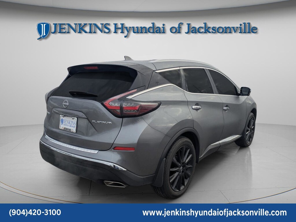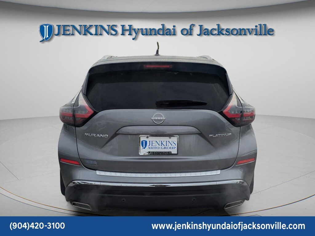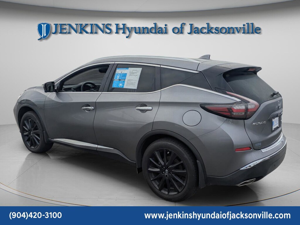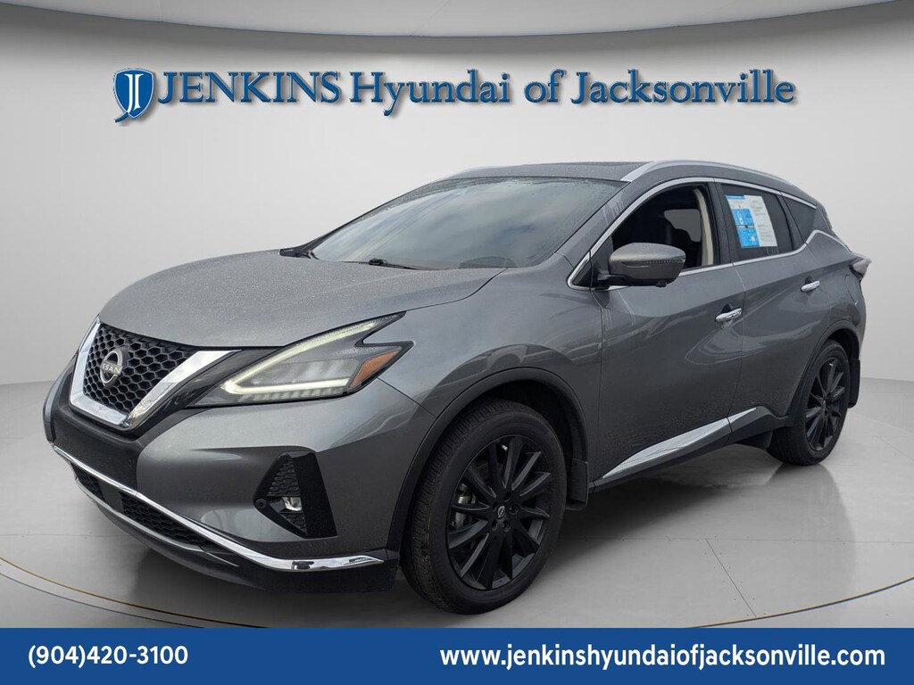 Meet the 2024 Nissan Murano Platinum (VIN 5N1AZ2DJ6RC113127) the perfect blend of bold style and everyday luxury. With its sleek floating roof design, aggressive V-Motion grille, and premium alloy wheels, this SUV makes a statement before you even hit the push-button start. Inside, youre wrapped in quilted leather-appointed seats, a panoramic moonroof, and a crystal-clear Bose premium sound system that turns every drive into a first-class experience. The smooth V6 engine delivers confident power while advanced safety tech like Intelligent Cruise Control and Blind Spot Warning keeps you protected. If you want an SUV that feels upscale, drives effortlessly, and stands out in any lot, this Murano Platinum is the one that makes your neighbors look twice. The price does not include tax, tag, license, an electronic filing fee of $449.00**, a private tag agency fee of $199.00**, and a predelivery service charge of $1199.00** **This charge represents costs and profit to the dealer for items such as inspecting, cleaning, and adjusting vehicles, as well as preparing documents related to the sale. * EPA-estimate metric: these are contingent on ideal conditions within a lab. Real-world situations such as carrying passengers or cargo, using climate control, driving style, and ambient temperatures can affect actual metrics. 20/28 City/Highway MPG CARFAX One-Owner. Clean CARFAX. This 2024 Nissan Murano Platinum in Gun Metallic features Cargo Package (Cargo Area Protector, Cargo Net, First Aid Kit, and Retractable Cargo Cover), 11 Speakers, 4-Wheel Disc Brakes, 4.667 Axle Ratio, ABS brakes, Air Conditioning, Alloy wheels, AM/FM radio: SiriusXM, AM/FM/CD/MP3/WMA Audio System, Auto High-beam Headlights, Auto tilt-away steering wheel, Auto-dimming Rear-View mirror, Automatic temperature control, Blind Spot Warning, Brake assist, Bumpers: body-color, Carpeted Floor Mats & Carpeted Cargo Mat, CD player, Child-Seat-Sensing Airbag, Compass, Delay-off headlights, Driver door bin, Driver vanity mirror, Dual front impact airbags, Dual front side impact airbags, Electronic Stability Control, Emergency communication system: NissanConnect Services (first 6 months included), Exterior Ground Lighting, Exterior Parking Camera Rear, Four wheel independent suspension, Front anti-roll bar, Front Bucket Seats, Front Center Armrest, Front dual zone A/C, Front fog lights, Front reading lights, Fully automatic headlights, Garage door transmitter: HomeLink, Heated & Ventilated Front Bucket Seats, Heated door mirrors, Heated front seats, Heated rear seats, Heated steering wheel, Illuminated entry, Illuminated Kick Plates, Illuminated Kick Plates (PIO), Interior Accent Lighting, Knee airbag, Leather steering wheel, Low tire pressure warning, Memory seat, Navigation system: NissanConnect with Navigation and Services, Nissan USB Charging Cable Set, NissanConnect featuring Apple CarPlay and Android Auto, NissanConnect Services Powered By SiriusXM, Occupant sensing airbag, Outside temperature display, Overhead airbag, Overhead console, Panic alarm, Passenger door bin, Passenger vanity mirror, Power door mirrors, Power driver seat, Power Liftgate, Power moonroof, Power passenger seat, Power steering, Power windows, Radio data system, Rear anti-roll bar, Rear Bumper Protector, Rear reading lights, Rear seat center armrest, Rear side impact airbag, Rear window defroster, Rear window wiper, Remote keyless entry, Security system, Semi-Aniline Leather-Appointed Seat Trim, Speed control, Speed-sensing steering, Speed-Sensitive Wipers, Splash Guards (B92), Split folding rear seat, Spoiler, Sport Pedals, Steering wheel memory, Steering wheel mounted audio controls, Tachometer, Telescoping steering wheel, Tilt steering wheel, Traction control, Trip computer, Turn signal indicator mirrors, Variably intermittent wipers, Ventilated front seats, Wheels: 20" Black Satin Alloy, and Wheels: 20" Unique Dark Hyper Silver . Visit our showroom 24/7 at Jenkinshyundaiofjacksonville or call 904