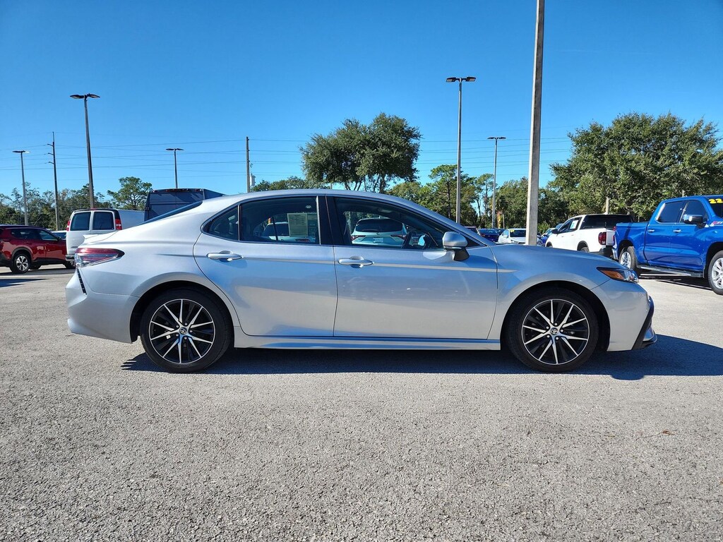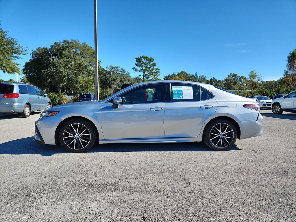 Silver 2023 Toyota Camry SE FWD 8-Speed Automatic 2.5L I4 DOHC 16V Black Artificial Leather, ABS brakes, Active Cruise Control, Alloy wheels, Electronic Stability Control, Front dual zone A/C, Heated door mirrors, Illuminated entry, Low tire pressure warning, Remote keyless entry, Traction control.