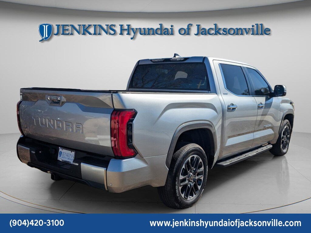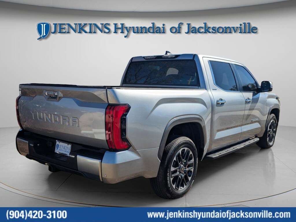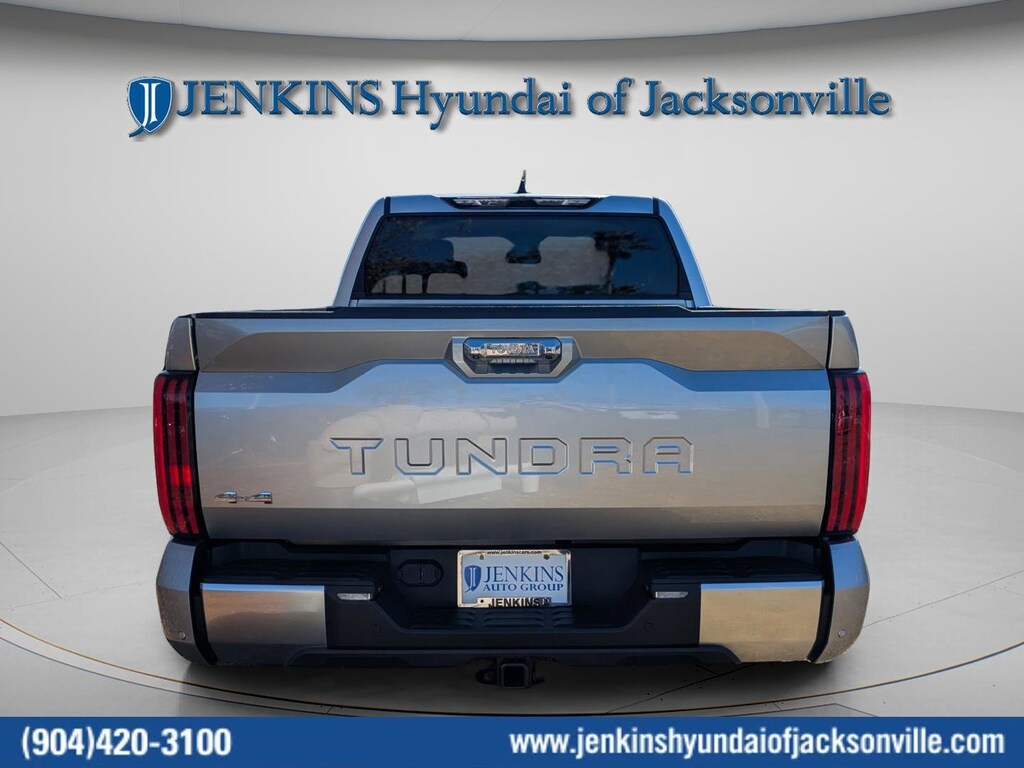 VIN 5TFJC5DB5RX073910 is a 2024 Toyota Tundra 4x4 that brings serious presence, power, and everyday practicality in one bold package. Under the hood youve got Toyotas proven i-FORCE twin-turbo V6 delivering strong torque for towing, hauling, or just owning the highway, paired with a smooth-shifting transmission and a confident 4WD system thats ready for job sites or weekend adventures. The redesigned body style gives it that aggressive, modern stance, while the spacious CrewMax cabin offers premium comfort, advanced tech, and the reliability Toyota trucks are famous for. Whether youre pulling a boat, loading up for a road trip, or just want a truck that makes a statement in the driveway, this Tundra checks every box capability, style, and long-term dependability. The price does not include tax, tag, license, an electronic filing fee of $449.00**, a private tag agency fee of $199.00**, and a predelivery service charge of $1199.00** **This charge represents costs and profit to the dealer for items such as inspecting, cleaning, and adjusting vehicles, as well as preparing documents related to the sale. * EPA-estimate metric: these are contingent on ideal conditions within a lab. Real-world situations such as carrying passengers or cargo, using climate control, driving style, and ambient temperatures can affect actual metrics. 19/22 City/Highway MPG CARFAX One-Owner. This 2024 Toyota Tundra Hybrid Limited in features 20" x 8" Alloy Wheels, 3.31 Axle Ratio, 4-Wheel Disc Brakes, 9 Speakers, ABS brakes, Air Conditioning, Alloy wheels, AM/FM radio: SiriusXM, Apple CarPlay/Android Auto, Auto High-beam Headlights, Auto-dimming door mirrors, Auto-dimming Rear-View mirror, Automatic temperature control, Brake assist, Bumpers: body-color, Delay-off headlights, Driver door bin, Driver vanity mirror, Dual front impact airbags, Dual front side impact airbags, Electronic Stability Control, Emergency communication system: Safety Connect (10-year trial), Exterior Parking Camera Rear, Front anti-roll bar, Front Bucket Seats, Front Center Armrest, Front dual zone A/C, Front fog lights, Front reading lights, Front wheel independent suspension, Fully automatic headlights, Garage door transmitter: HomeLink, Heated & Ventilated Front Bucket Seats, Heated door mirrors, Heated front seats, Heated steering wheel, Illuminated entry, Knee airbag, Leather Shift Knob, Low tire pressure warning, Memory seat, Navigation System, Occupant sensing airbag, Outside temperature display, Overhead airbag, Overhead console, Panic alarm, Passenger door bin, Passenger vanity mirror, Power door mirrors, Power driver seat, Power passenger seat, Power steering, Power windows, Radio data system, Radio: Audio Plus, Radio: Premium Audio w/JBL, Rear reading lights, Rear seat center armrest, Rear step bumper, Rear window defroster, Remote keyless entry, Security system, SofTex Seat Trim, Speed control, Speed-sensing steering, Split folding rear seat, Steering wheel mounted audio controls, Tachometer, Telescoping steering wheel, Tilt steering wheel, Traction control, Trip computer, Turn signal indicator mirrors, Variably intermittent wipers, Ventilated front seats, and Voltmeter . Visit our showroom 24/7 at Jenkinshyundaiofjacksonville or call 904-420-3100. 4WD