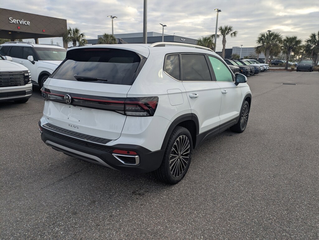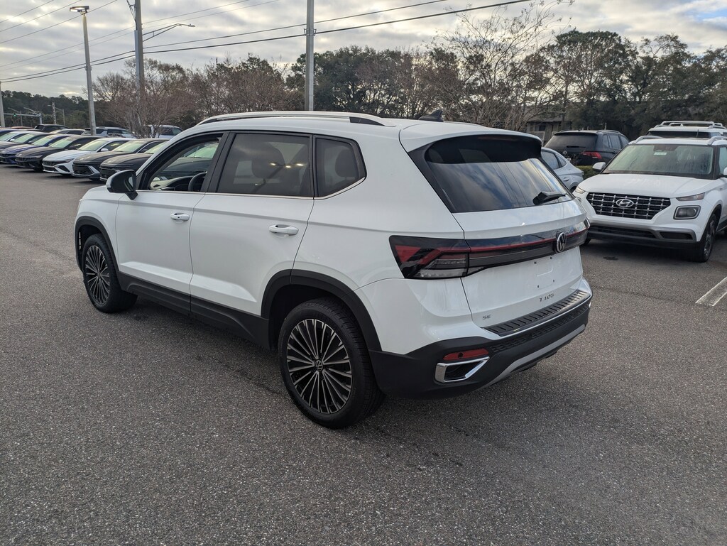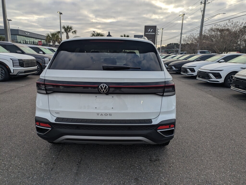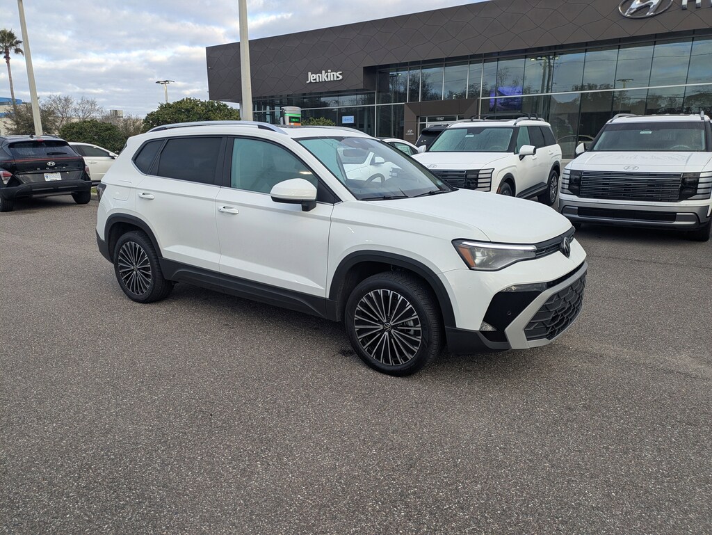 The price does not include tax, tag, license, an electronic filing fee of $449.00**, a private tag agency fee of $199.00**, and a predelivery service charge of $1199.00** **This charge represents costs and profit to the dealer for items such as inspecting, cleaning, and adjusting vehicles, as well as preparing documents related to the sale. * EPA-estimate metric: these are contingent on ideal conditions within a lab. Real-world situations such as carrying passengers or cargo, using climate control, driving style, and ambient temperatures can affect actual metrics. 28/36 City/Highway MPG CARFAX One-Owner. Clean CARFAX. This 2025 Volkswagen Taos 1.5T SE in Pure White features Panoramic Sunroof Package, 4-Wheel Disc Brakes, 6 Speakers, ABS brakes, Active Blind Spot Monitor, Air Conditioning, Alloy wheels, AM/FM radio: SiriusXM with 360L, Auto High-beam Headlights, Auto-Dimming Rearview Mirror with HomeLink Connect, Automatic temperature control, Brake assist, Bumpers: body-color, Cloudtex and Cloth Seating Surfaces, Compass, Delay-off headlights, Driver door bin, Driver vanity mirror, Dual front impact airbags, Dual front side impact airbags, Electronic Stability Control, Emergency communication system: VW Car-Net Safe & Secure 5-year, Exterior Parking Camera Rear, Front anti-roll bar, Front Bucket Seats, Front Center Armrest, Front dual zone A/C, Front reading lights, Front Strut Rear Torsion Beam Suspension, Front wheel independent suspension, Fully automatic headlights, Heated door mirrors, Heated Front Bucket Seats, Heated front seats, Heated steering wheel, Illuminated entry, Leather Shift Knob, Low tire pressure warning, Occupant sensing airbag, Outside temperature display, Overhead airbag, Overhead console, Panic alarm, Passenger door bin, Passenger vanity mirror, Power door mirrors, Power driver seat, Power steering, Power windows, Radio data system, Radio: MIB3 Composition Media AM/FM/HD, Rain sensing wipers, Rear anti-roll bar, Rear seat center armrest, Rear window defroster, Rear window wiper, Remote keyless entry, Rubber Mats Kit, Security system, Speed control, Speed-sensing steering, Split folding rear seat, Spoiler, Steering wheel mounted audio controls, Tachometer, Telescoping steering wheel, Tilt steering wheel, Traction control, Trip computer, Variably intermittent wipers, and Wheels: 18" 2-Tone Machined Alloy . Visit our showroom 24/7 at Jenkinshyundaiofjacksonville or call 904-420-3100. FWD